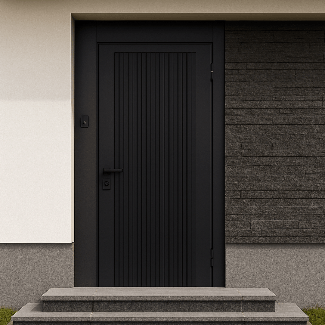 Uși metalice de exterior, placate cu furnir natural Baltic Naval, realizate la comandă, în funcție de dimensiunile și cerințele proiectului.