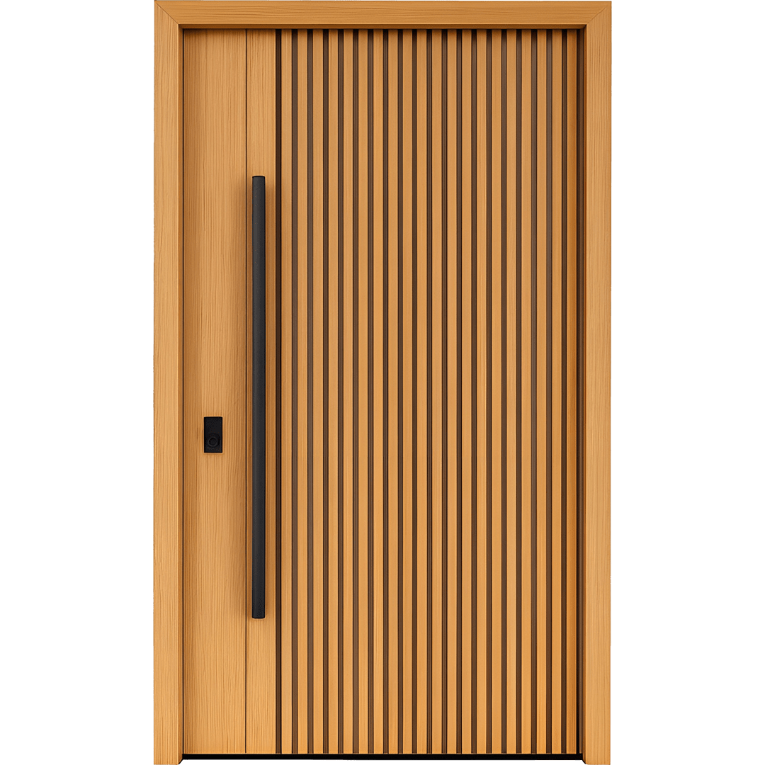 Uși metalice de exterior, placate cu furnir natural Baltic Naval, realizate la comandă, în funcție de dimensiunile și cerințele proiectului.